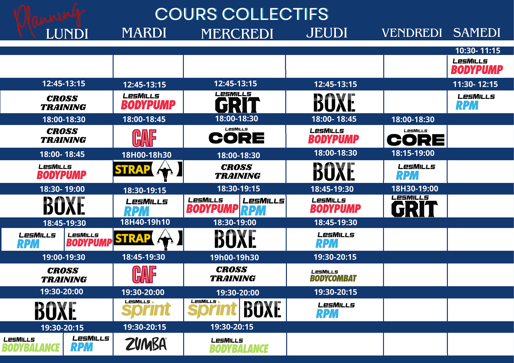 - Cours collectifs (18 participants max) : Bodypump, RPM, Grit, Bodycombat, Bodybalance, Core, Caf, Zumba,
